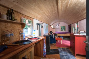 Der Wagen ist vor einem Jahr Gebaut worden und wurde nur wenig genutzt.Die AuĂenverschalung ist eine LĂ€rchenschalung mit Edelstahlschrauben befestigt.Der Wagen ist in den WĂ€nden mit 60 mm HolzfasedĂ€mmung und im Dach mit 100 mm gedĂ€mmt.Von innen ist eine OSB mit Lehmstreichputz und der FuĂboden ist Douglasie(LĂ€rche)geölt.
